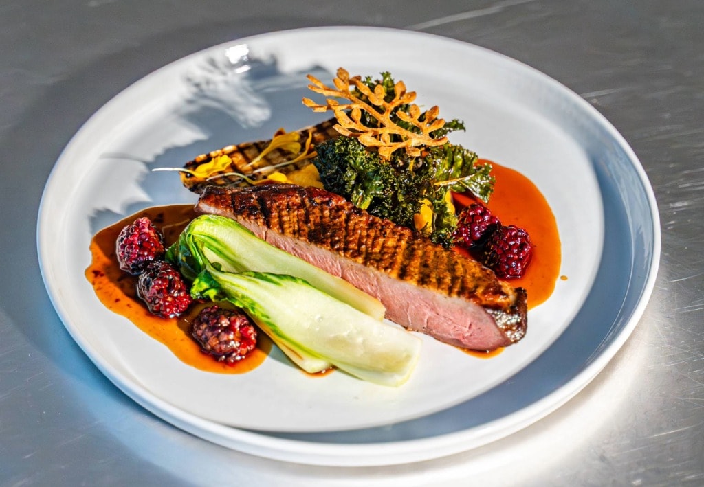 Andebryst, Hokkaido-græskarpuré med ingefær, svampe, tuile og brombærsauce