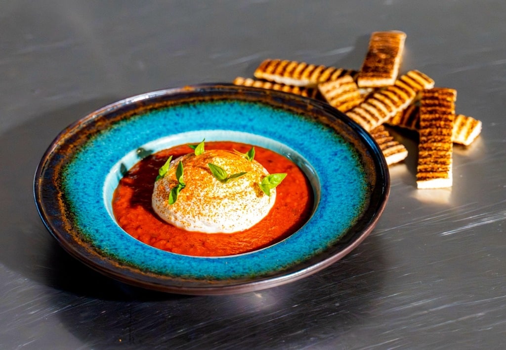 Brændt peberfrugt- og tomatsuppe med basilikum- og burrataskum