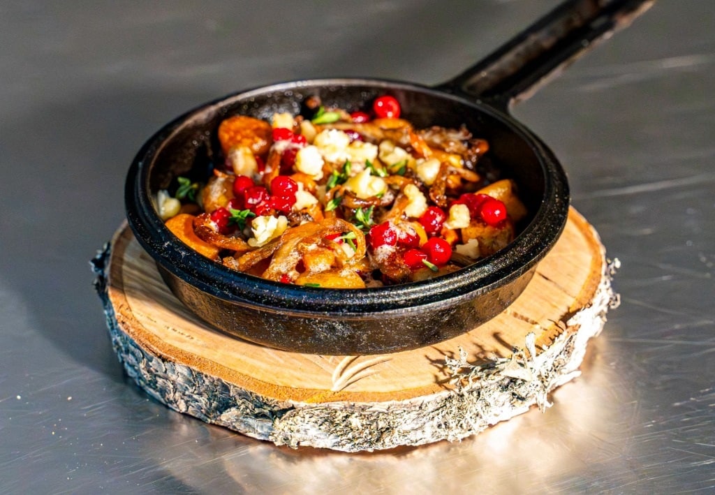 Nordiske mini-dumplings med brunet smør, svampe, tyttebær og Gammel Knas