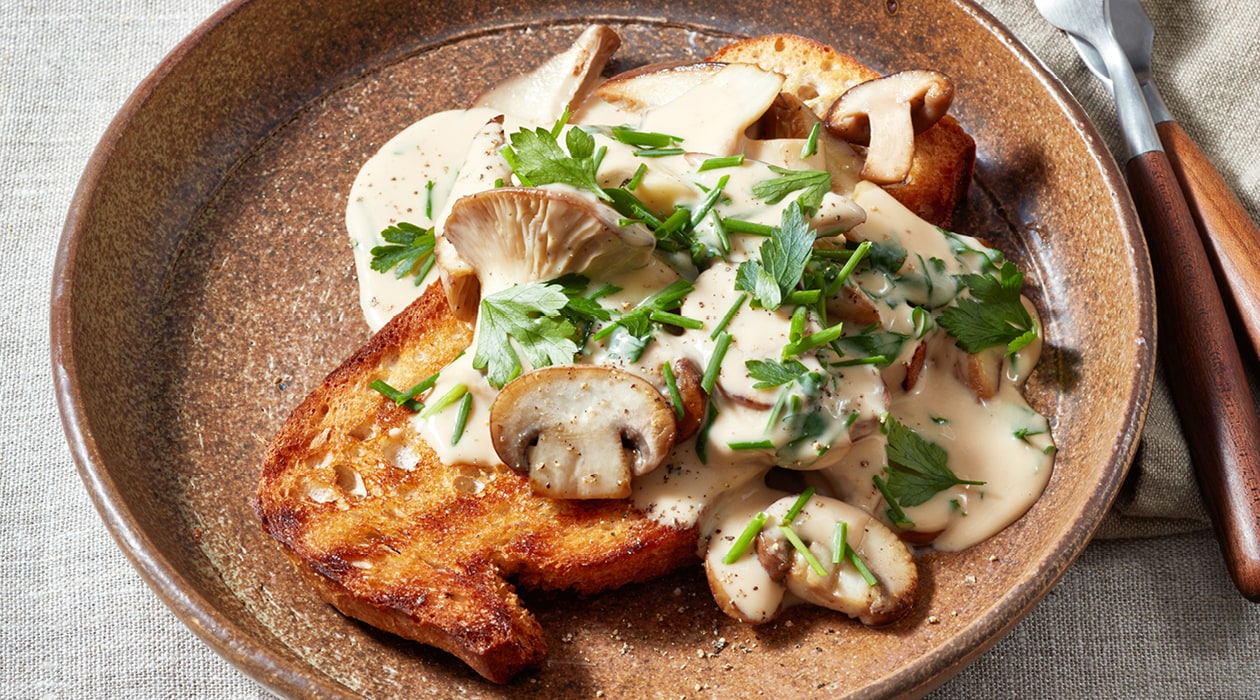 Sauterede svampe i en cremet sauce på surdejsbrød